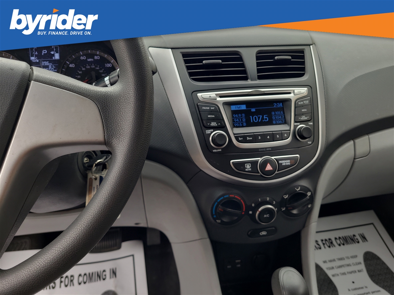 KBB.com 5-Year Cost to Own Awards. Boasts 37 Highway MPG and 26 City MPG! This Hyundai Accent boasts a Regular Unleaded I-4 1.6 L/97 engine powering this Automatic transmission. TRIATHLON GRAY METALLIC, REAR CUPHOLDER INSERT W/O CONSOLE ARMREST, GRAY, PREMIUM CLOTH SEAT TRIM.* This Hyundai Accent Features the Following Options *GRAY, CLOTH SEAT TRIM, FIRST AID KIT, CARPETED FLOOR MATS, CARGO TRAY, CARGO NET, Wheels: 14 x 5.0J Steel w/Cover, Urethane Gear Shifter Material, Trunk Rear Cargo Access, Trip computer, Transmission: 6-Speed Automatic w/SHIFTRONIC -inc: active ECO system and Hillstart Assist Control, 2.937 Axle Ratio.* Stop By Today *Test drive this must-see, must-drive, must-own beauty today at Byrider - MS104, 2600 Highway 80 East, Pearl, MS 39208.