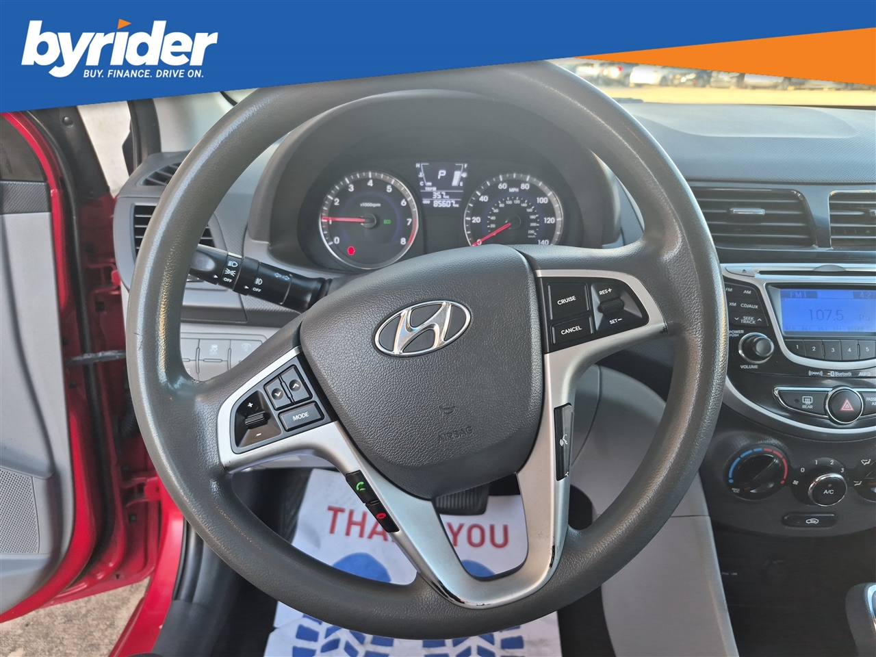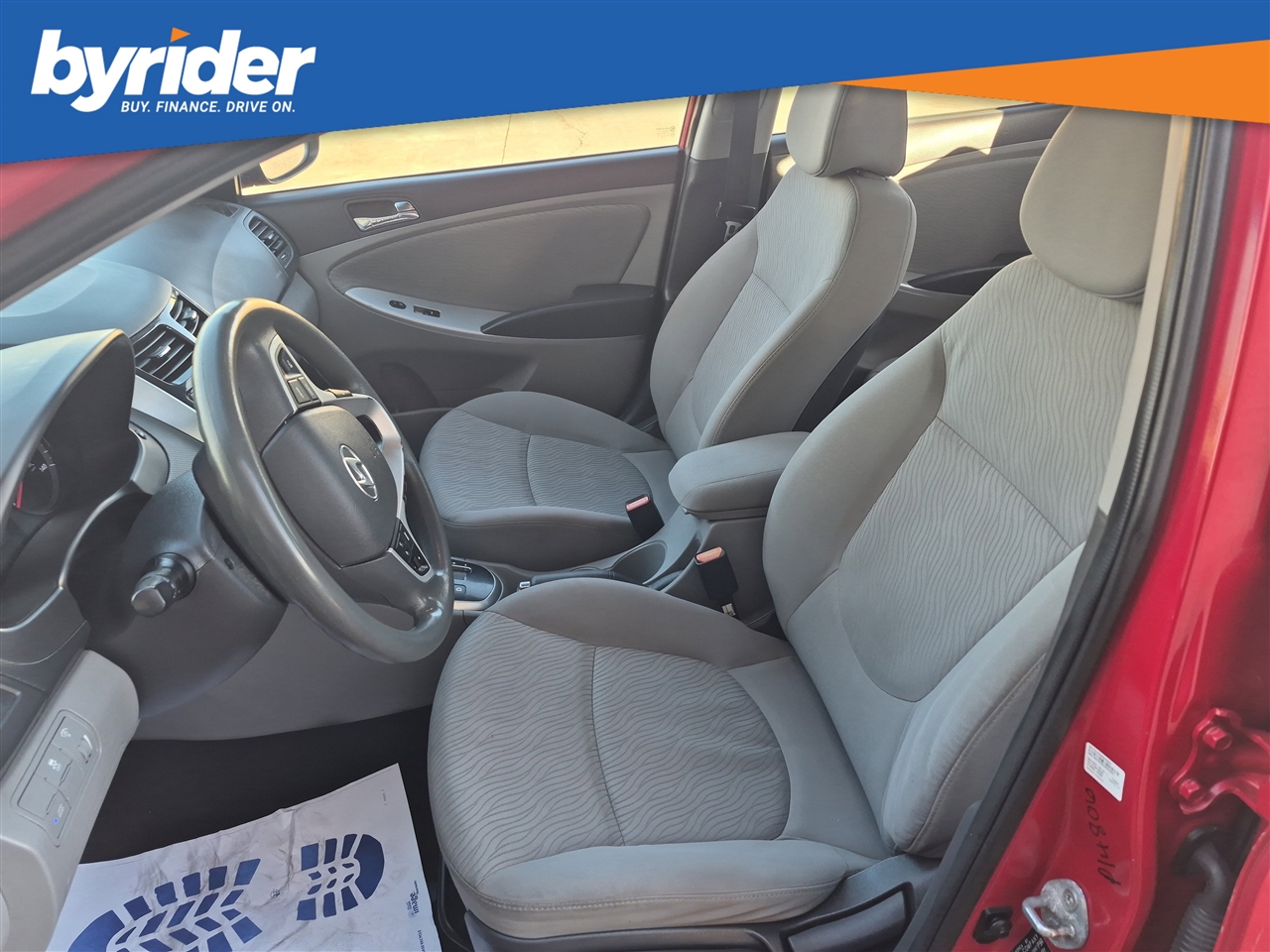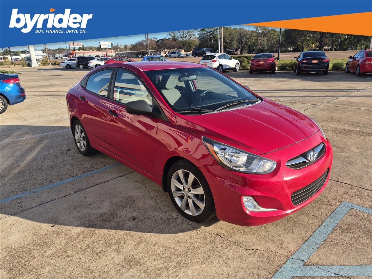 Only 85,585 Miles! Delivers 37 Highway MPG and 28 City MPG! This Hyundai Accent boasts a Gas I4 1.6L/97 engine powering this Automatic transmission. PREMIUM PKG -inc: steering wheel audio controls, cruise control, Bluetooth, premium cloth seats, chrome interior door handles, piano black accents, sliding front armrest w/storage box, fog lights, 16 alloy wheels w/P195/50R16 tires, rear disc brakes, MUDGUARDS, IPOD CABLE.* This Hyundai Accent Features the Following Options *CARPETED FLOOR MATS, CARGO NET, BOSTON RED, Warning lights -inc: oil pressure, battery, door ajar, airbag, seatbelt, TPMS, low fuel, brake, check engine, ABS, MDPS, ESC, fuel cap, trunk open, Warning chimes -inc: key-in-ignition, door ajar, seatbelt, Vehicle stability management system -inc: electronic stability control (ESC) & traction control system (TCS), Urethane shift knob, Trip computer -inc: distance to empty, average fuel consumption, average vehicle speed, elapsed time, instant fuel consumption, Torsion axle rear suspension -inc: gas shock absorbers, coil springs, Tire Pressure Monitoring System.* The Experts' Verdict...*As reported by KBB.com: If your limited budget has you thinking used car, you might be pleasantly surprised at just how much new car the 2013 Hyundai Accent can get you for around $15,000.* Visit Us Today *Treat yourself- stop by Byrider - MS104 located at 2600 Highway 80 East, Pearl, MS 39208 to make this car yours today!